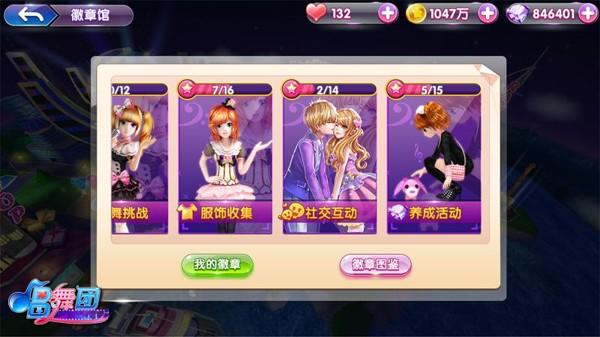 唱舞团中的徽章分为4个类型:唱舞挑战、服装收集、社交互动、养成活动共有57个徽章。根据完成目标的难易,徽章也分为普通和高级,高级的徽章可是会动的哦!