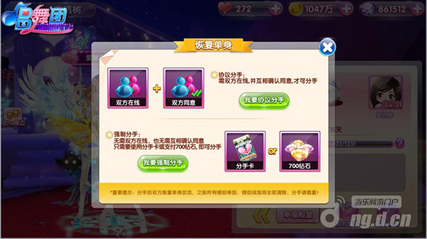已经结缘成功的小伙伴,如果需要恢复单身或者换个伴侣的话,那么同样在幸福树中实现哦,有“协议分手”和“强制分手”2种方式选择。