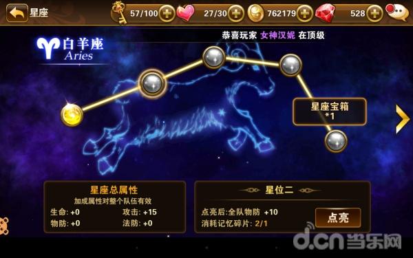 不仅如此,该游戏的玩法同样可以说是非常多样化,随着玩家等级的提升,游戏也会开启越来越多的玩法。例如当玩家等级达到15级的时候,便会开始星座玩法,玩家可以通过消耗记忆碎片来点亮星座。游戏中玩家可以按照白羊座、金牛座、双子座、巨蟹座、狮子座、处女座、天秤座、天蝎座、射手座、摩羯座、水瓶座、双鱼座的顺序点亮星座之后,点亮不同的星座后,还可以获得生命,攻击,物防,法防等加成,大幅提升团队属性。除此以外,游戏中还包括有竞技场、抢夺、公会、爬塔等玩法和对应的资源在等着各位玩家。