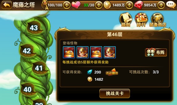 在《杰克与魔豆》中,杰克爬上魔藤之后看到了神奇的巨人国,获得了宝物。在《有杀气童话》里,爬上魔藤同样能获得海量的宝物——金币和魔晶。在“魔藤之塔”玩法中,玩家通过挑战获得奖励,且每成功挑战5层还将额外获得一个神秘宝箱的奖励哦,赶紧带上自己的强力小伙伴一步一步往上爬吧!