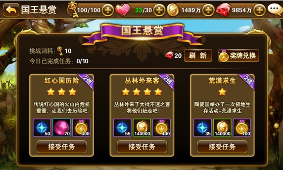 在主角等级达到20级的时候,游戏将开启“国王悬赏”玩法。国王悬赏有不同的任务等级,任务等级越高,奖励越丰厚,可以获得进阶石,金币,经验药水等难得的材料。完成任务还能获得奖牌,使用奖牌可以兑换很多传说中的人物哟!