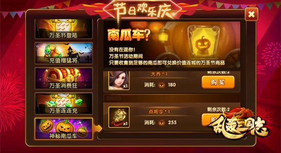 呜呜呜,神秘南瓜车来啦!万圣节活动期间,玩家可以在神秘南瓜车上使用“吓人的南瓜”兑换到各种各样万圣节超值好礼。全新武将大乔、超值道具点将令、超爆道具随机名将录、稀有道具突破石、橙色装备宝箱等超值好礼超值兑换!赶快上车!