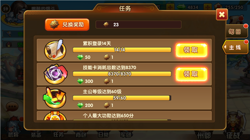 《乱轰三国志》中,日常任务分为每日任务和主线任务,除了每天露红点发金光的奖励外,你是否发现过其他奖励呢?《乱轰三国志》有一个隐藏任务奖励兑换,点击右侧的主线任务,玩家在完成主线任务时会获得历练点,点击左上角的兑换奖励,便可进行兑换。
