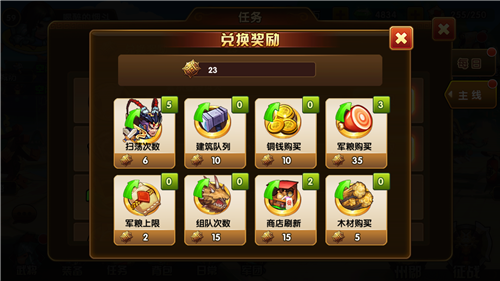 兑换奖励以功能buff为主,种类繁多,可以大量增加玩家对国家基础属性的建设,比如扩大仓库、金币上限、建筑等级等,这类功能在前期作用巨大,可谓可遇而不可求。