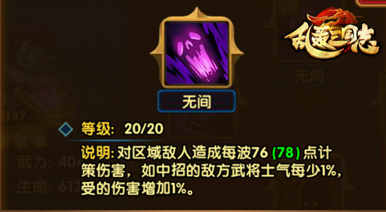 作为《乱轰三国志》中的冷门后排,并不是没有小伙伴培养过贾诩。扔到战场上,平砍输出不赖,两个技能一个烧士气、一个沉默,略有点小逆天啊这货!n回合后,士气max,放大招:一个威武霸气的魔影略过敌军前排,范围大,声光佳!只是这伤害,似乎还不如平砍,这什么鬼?回头再翻过技能描述,真相大白——