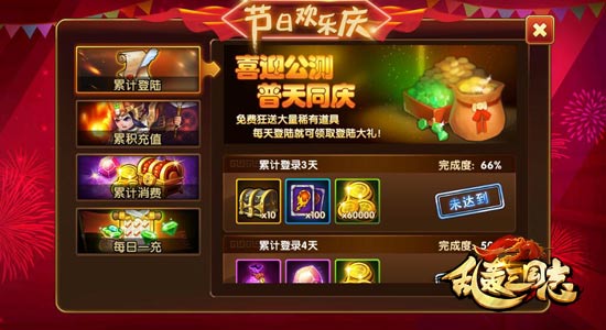 《乱轰三国志》公测狂欢五大活动燃爆三国!同时,游戏内还有大量福利回馈百万玩家!累计登录送好礼,海量铜钱、技能卡、魂玉、精炼石、天品重铸石等实用奖励免费送!现在就登录领取吧!