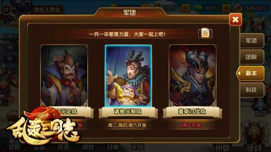 加入军团,开挂狂刷专属副本,海量福利抱回家!“黄巾平定战”、“诸侯压制战”、“董卓讨伐战”三大副本交替开放,一波又一波凶悍NPC等你来挑战。军团成员攻击NPC伤害会累加,秒杀NPC超轻松!