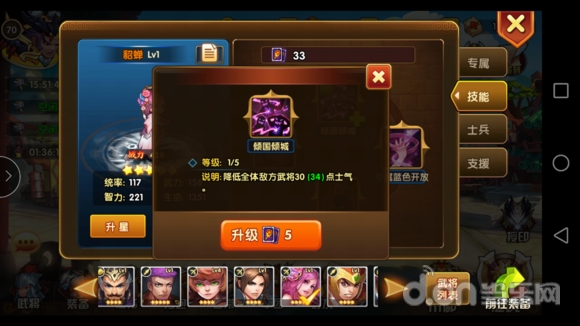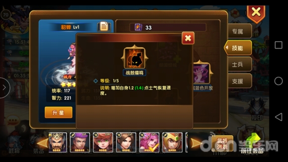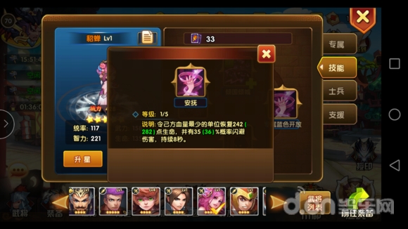 这个技能简直可以说是神技中的神技,单体加血,外加超级高的闪避,而且持续8秒,算是很不错了,可以让很多武将生存率极大的提高,最好能加满这个技能。