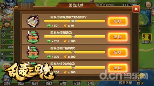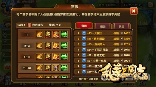 《乱轰三国志》国战吸引人之处除了各种各样的“策略”玩法,还有丰厚的国战奖励。“国战成就”,完成任务就能拿到大量水晶、国家币,国家币可兑换高级装备。同时,排行奖励更诱人,点将领免费十连抽,神将轻松到手。高级兵书全民提升战斗力。