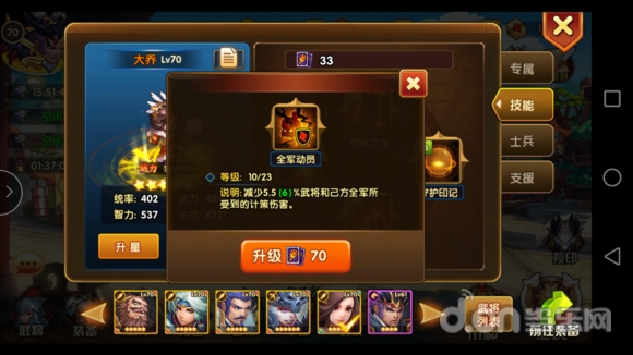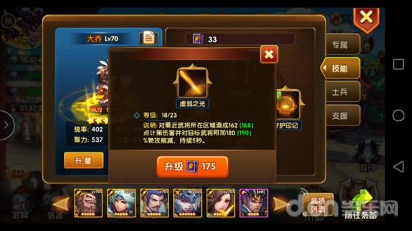 这个技能更是谁用谁知道,攻击力一般,但是附加五秒削弱敌人的物理攻击,看图片就知道削弱的多么夸张,几乎可以说在这五秒内一个物理型的武将等于是废了。不过这个技能也过分的看人品,如果削弱的是张辽周泰之类,真的是乐晕了,但是如果中招的是董卓那种几乎不需要攻击力的肉盾,或者是敌人的策攻型武将,那真的是欲哭无泪。不过由于这个技能极度变态的附加效果,还是需要适当加的,但是技能等级只影响削弱的攻击百分比,不增加时间,所有觉得在技能点紧张的情况下加到你觉得差不多就行,后期技能点多了可以考虑加满