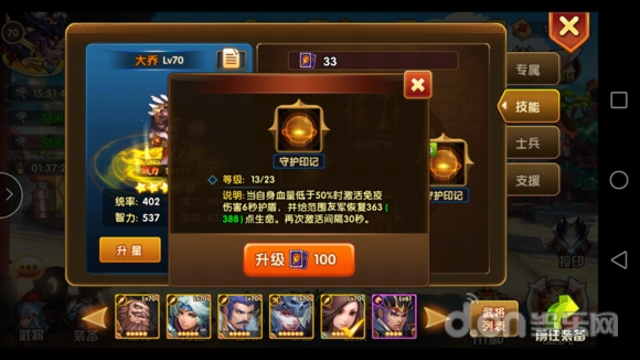 这个技能很有意思,血量少了有6秒的无敌,同时给周围友军加血,不过那点血量可有可无,无敌是真的实用,面对颜良或者马超,存活率高了很多,看情况加技能吧。