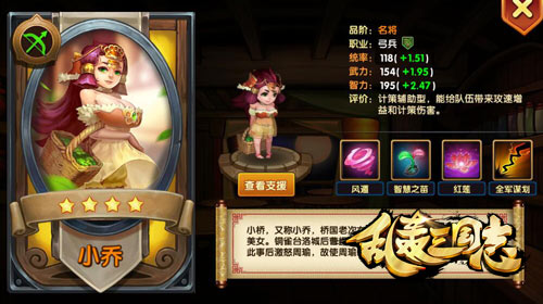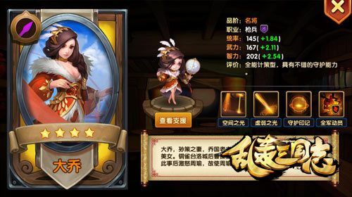 最后,我们来说说大乔。大乔是一名全能计策型武将,能输出,能辅助,能加血,能控制,能免策伤,能无敌,还能把推进的敌将传回去,是《乱轰三国志》目前口碑最好的女辅助哟。