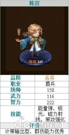 小编点评: 陈宫在乱轰三国志算是比较特殊的计策型武将,他是盾兵,但是比较克制敌方后排的计策型弓兵。