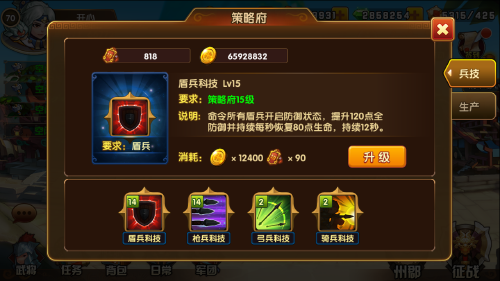 遥记得当年孔明发明木牛流马,让部队行军节省巨额军费开支,以逸待劳一战横扫曹军!《乱轰三国志》中的“策略府”正有如此神通,玩家可以在使用策略府提升自己铜矿开采技术、木材产量,田产数量。更重要的是,也可以升级各种小兵技能,堪称三国中的军火库!升级兵种科技所需要的功勋,可以通过千里走单骑获得。