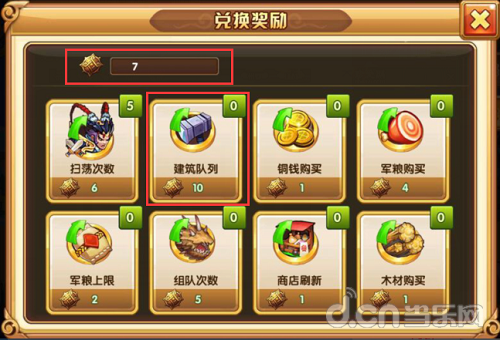 下面就是兑换奖励界面,左上方是主公的历练点数,下面是奖励,建议主公先兑换建筑队列,为什么要兑换建筑队列,下面会说的,别着急嘛