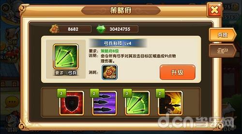 策略府是升级科技的地方,玩家可以在这里提升自己的铜钱、木材产量,也可以升级各种小兵技能,让小兵在战斗中发挥更大作用!