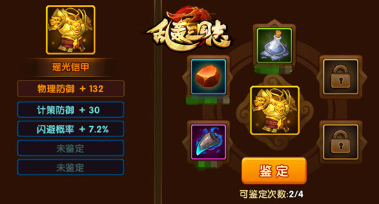在《乱轰三国志》中,当玩家拿到一件装备后,只能得到它的基础属性,包括攻、防、策攻、策防等,比较单一。另有若干属性处于未鉴定状态,需要玩家手动鉴定方可展示。鉴定出的属性则五花八门,从暴击、闪避,到吸血、回气应有尽有。橙色装备可以通过鉴定得到四条属性,多种组合下,几乎不可能会有完全一样的两件。