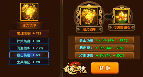 在《乱轰三国志》中,当玩家鉴定了一件装备之后,如果对鉴定出的属性不满意,可以通过重铸系统进行改变。重铸属性为随机生成,玩家可以对一条属性进行无限制重铸,直到找到自己满意的那一条。