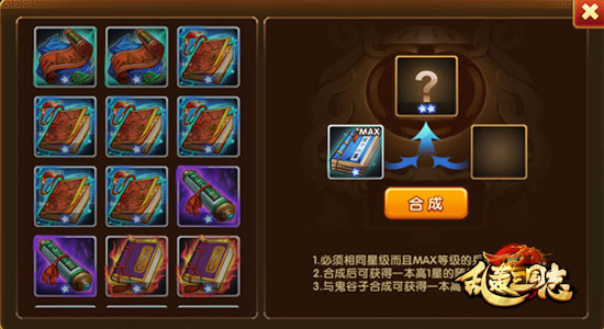 想要兵书威力更强大?可以通过两种方式:一是强化,玩家可以使用道具墨对兵书进行强化从而提升威力;二是合成,玩家可以使用相同星级而且MAX等级的兵书进行合成可合成高1星的随机兵书,如果与鬼谷子进行合成可获得一本高1星级的原兵书一本。