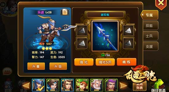 武将,是《乱轰三国志》的关键,提升武将是提升你实力的重中之重。目前,玩家可以从武将的等级、星级、专属、技能、装备多个方面对武将进行强化。其强化所消耗的道具大部分在征战副本中有掉落!