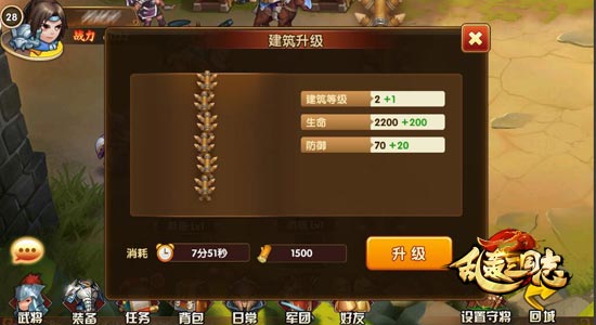 《乱轰三国志》是一款三国攻防战略手游,想要提升实力当然还可以从城防入手啦!玩家朋友可以通过主界面的城防进入,升级主城的拒马、箭塔等建筑物加固城池,从而提升战斗力。