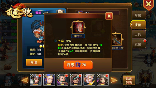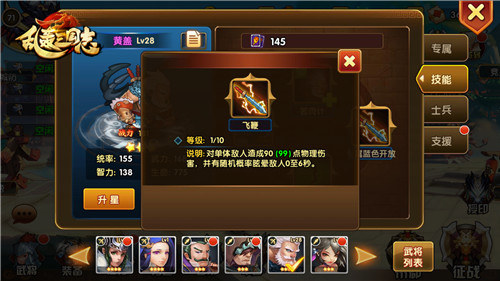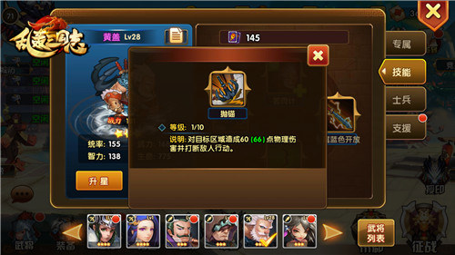 黄盖的打断技能【抛锚】属于范围性技能,可谓一拉一大片,对于兵将乱斗一起的《乱轰三国志》来说,一次打断可以形成大量且大范围的减伤效果,与两军对垒中十分受用!而控制技【飞鞭】可将敌人随机眩晕0~6秒,对于拥有大招【苦肉计】高单体输出加成和100%攻速加成的黄盖来说,如果运气好的话,可快速斩取敌方上将首级!