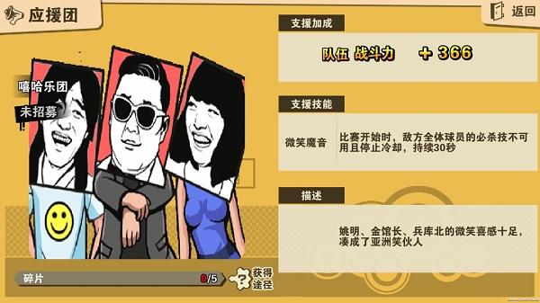 点击主界面右侧的“应援团”按钮,进入玩法界面。嘻哈乐团、篮球三姐妹、亚洲笑伙人、三洞琴魔等等。收集到指定数量的碎片后,即可激活一个应援团。不同的团队给队伍的战斗力加成不同,技能也各自有别。