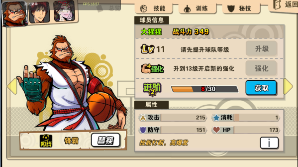 再来看大猩猩的技能,必杀技——金刚怒吼功,打断所有地方动作并晕眩,一个可以两用的技能,除了可以拿回球权之外,也可以晕眩后直接得分,非常霸道无敌!