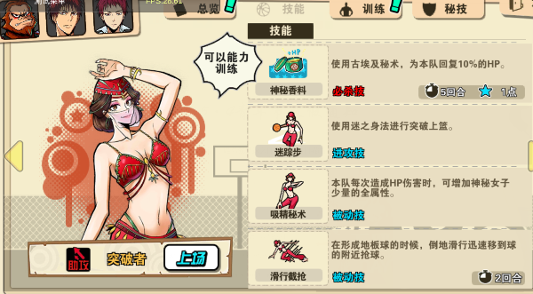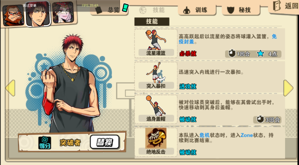 我们先看看火神的技能,一个必杀技,还有进攻技和被动技,被动技能不用多说了,大多以提升属性或者更改当前技能策略为主,必杀技是可以扭转战局的,火神的必杀技是“流星灌篮”几乎就是直接得分,另外的进攻技能还有个过人扣篮一个可以算是防守的技能“追身盖帽”,可以在被过了之后再追上去盖帽,其实还是一个非常实用的技能,总体算起来火神可以算是一个稳定的爆发点以及具备防守的点,算是攻守兼备的一个角色吧!