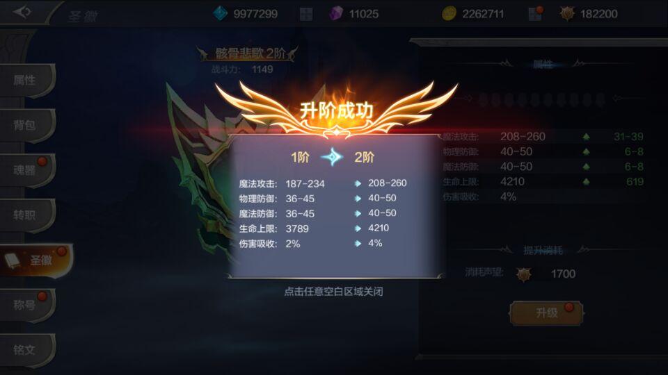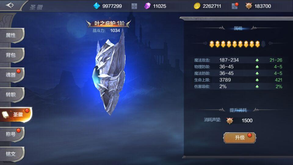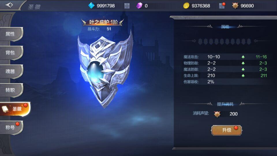 每一阶的圣徽有十个等级,每升一级,属性会有些许的提升,在升到十级的之后,圣徽可以进阶到下一阶段,每次进阶圣徽属性将大幅提高。