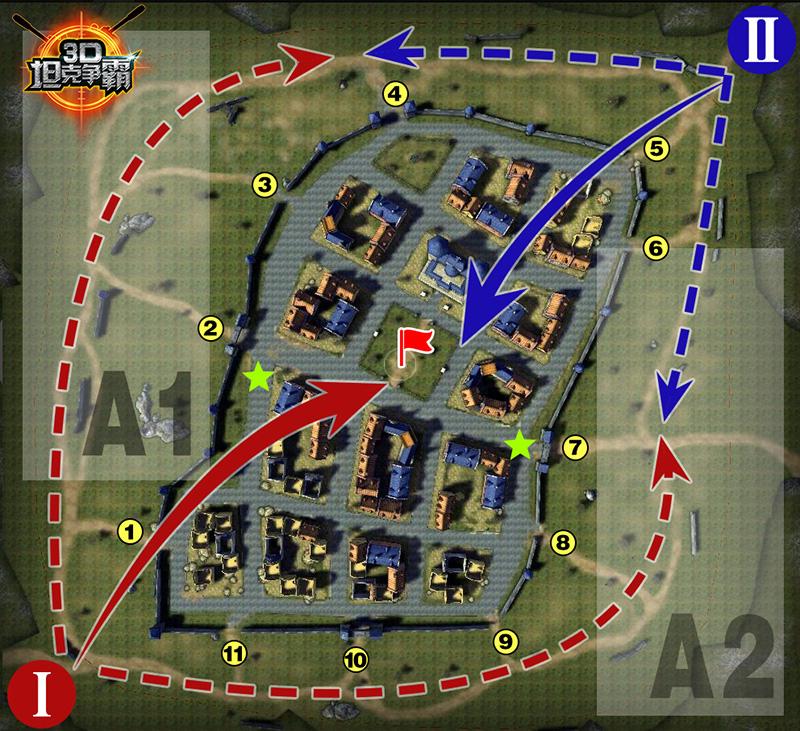 目前相对合理的分配是中坦和轻坦进入A1或A2区域,重坦进入城镇卡掩体压制敌人,但需要根据队伍坦克型号构成进行灵活分配。图中2号和7号黑枪位附近的两个绿色五角星区域是重坦卡点的好位置,既可以盯住黑枪位,又可以防止敌人包抄。
