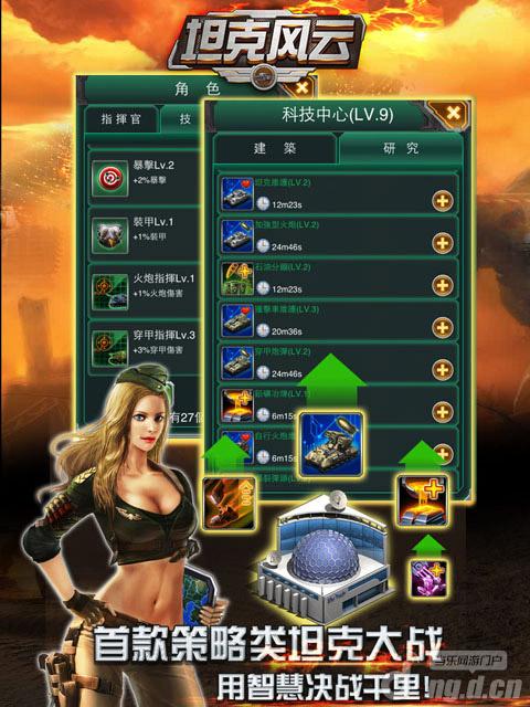 强大的装甲师团永远离不开科技的辅助,《坦克风云》不仅让你建造种类丰富的装甲坦克,更提供了从穿甲能力、防御能力、命中辅助,甚至爆击属性等一系列科技系统,全面提升你军队的实力。与其他同类游戏中笼统的升级概念不同,《坦克风云》还为各位指挥官准备了不同兵种的升级方案——喜欢冲锋陷阵那就建议你升级主战坦克的装甲、回避能力,喜欢用火炮蹂躏对手的自然就要强化命中和爆击,有针对性的研究科技是你称霸天下的关键!