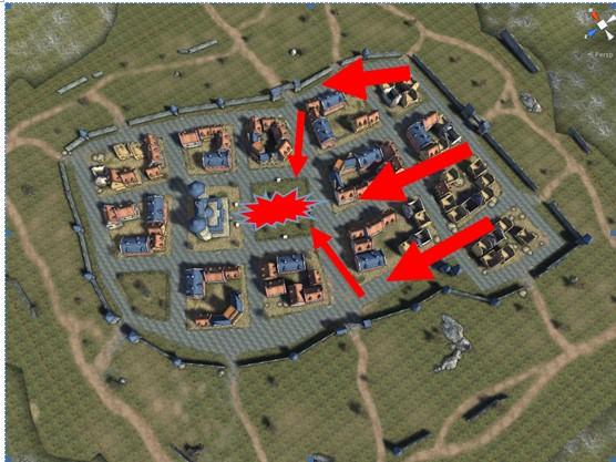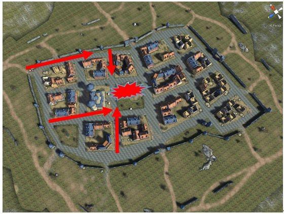 各类型坦克可分成三路成小队前进,两侧翼从小城外围包抄到敌人侧后方,中路小队到战旗地点隐蔽吸引敌人注意。