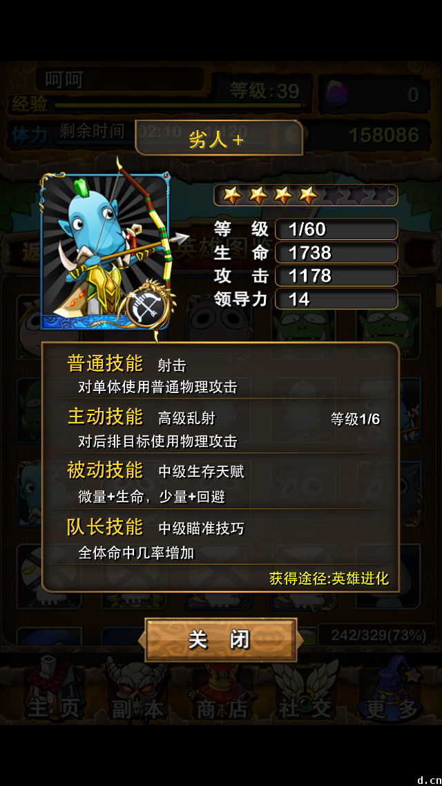 特点:物理输出,血量中等,命中较高,攻击高,尤其成长到蓝色金龙时,第一轮就是主动技能的后排乱射,如果技能等级高、受好友攻击加成的话,秒掉后排不是难事;