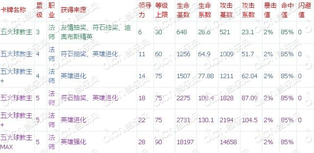注:只需要找属性相近、职业相同的卡牌均可代替表格中给出的指定卡牌,刷主角卡的成功率并不是100%,刷主角卡失败的因素主要有两个:1、小怪太变态,直接秒掉你的指定卡;2、主角卡打出暴击秒掉你的指定卡。由于2.3版本更新之后迪奥布斯部分怪物卡牌数据有所改变,故以上方法刷五火球教主可能会出现一定的偏差。