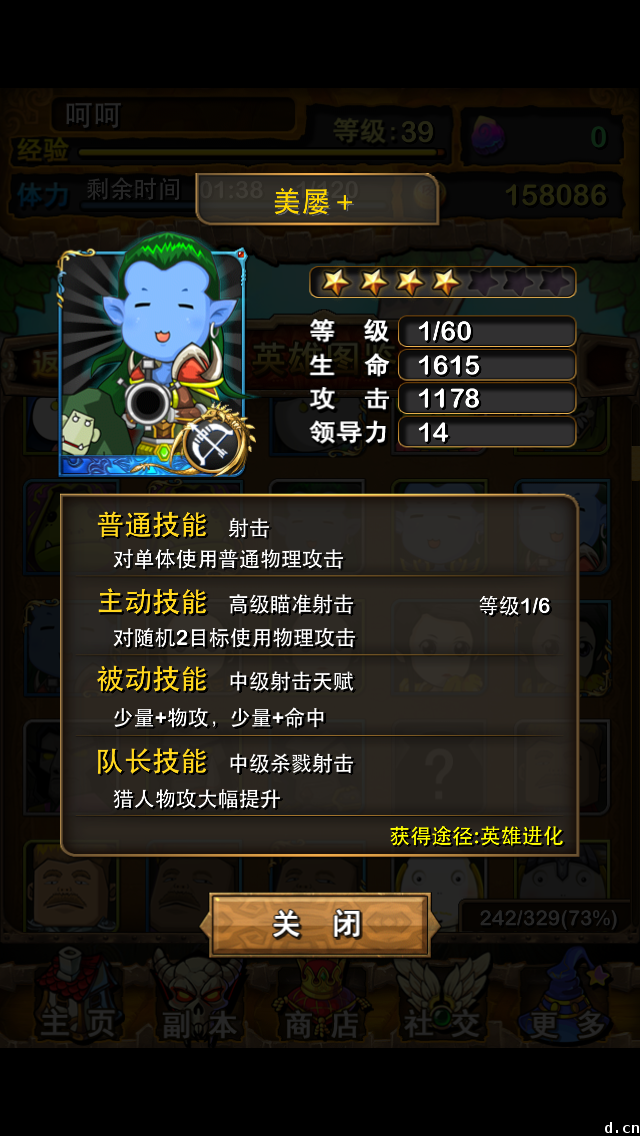 1技能单体普通物理攻击,2技能随机2目标物理攻击,被动加物攻和命中,队长技能加猎人物理攻击;
