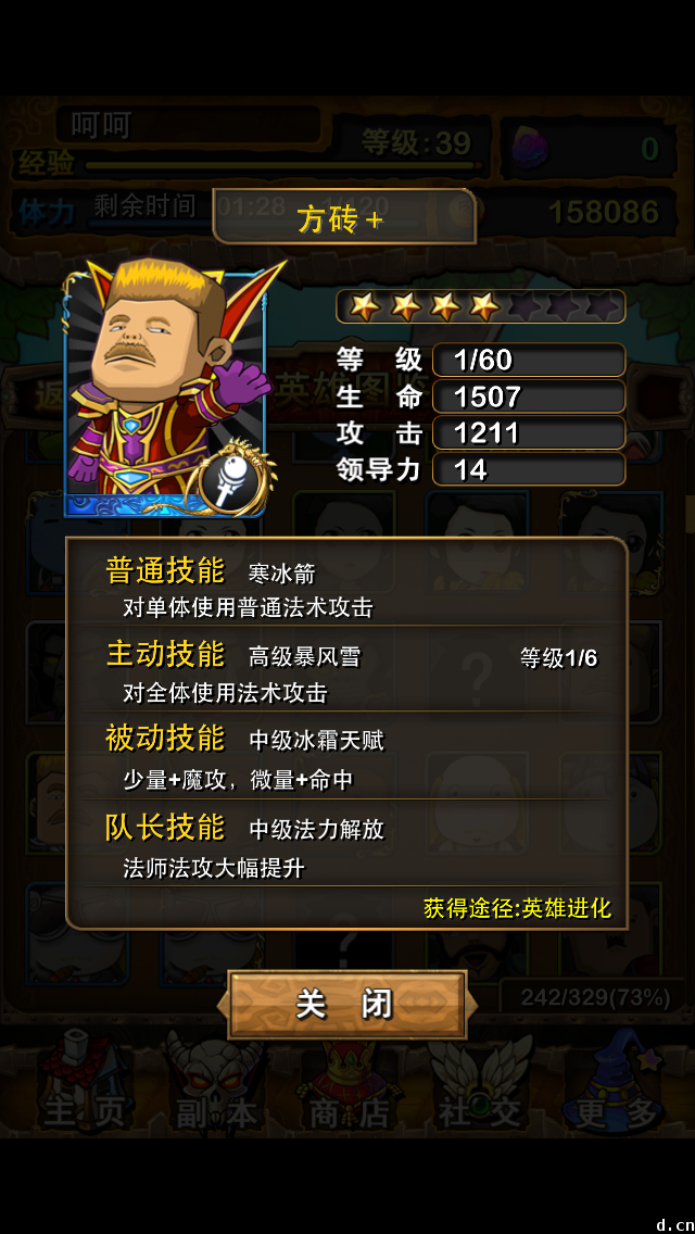 1技能单体普通法术攻击,2技能全体法术攻击,被动加魔攻和命中,队长技能加法师法术攻击;