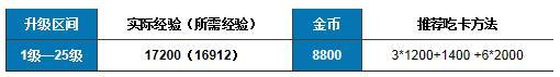 白卡(1级到25级):这个阶段需要经验16912点,一般情况下升级三次即可达到25级。下面这种方法是最优吃卡方法,只需要耗费10张素材卡,并且耗费金币也仅为8800点。