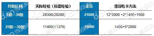 绿卡(25级到30级):这个阶段需要的经验值为11376点,一般情况下吃两轮即可达到30级满级,从而保证不浪费金币或是素材卡