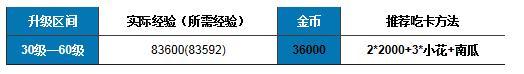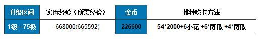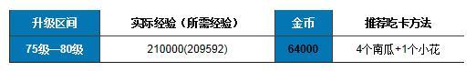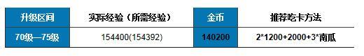 蓝卡(70级到75级):突破+3的阶段,供需要经验值154392点,推荐采用2x1200+2000+三个南瓜的吃法,这样能够保证金币只花费42000点。