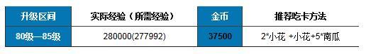 紫卡(80-85级):紫卡突破+2阶段,此阶段需求经验值277992点,通过2*小花 +小花+5*南瓜的组合,即可保证直接升级到85级,而花费的金币则为64000点。