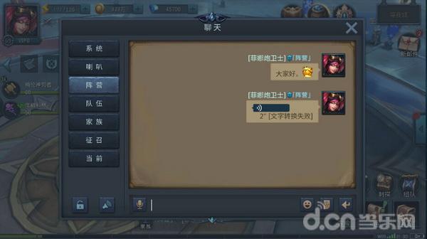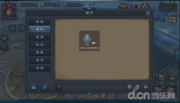 点击屏幕下方的语音按钮可以切换语音聊天频道(队伍和家族)。长按则可以录制语音并发送。也可以点击屏幕下方的聊天框,打开聊天界面,如果录制内容有有误,可以采取录制完成后不松开手指,手指直接上划动来取消发送。