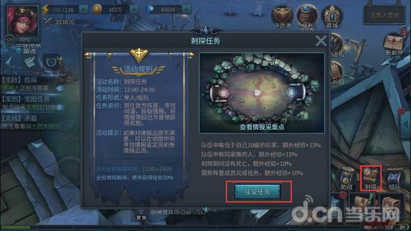 刺探任务开启期间,玩家进入主城会有弹出框提示,点击前往即可接受刺探任务。也可在主界面右下角,点击【刺探】打开刺探任务界面参与,每个玩家每天仅可参与3次。