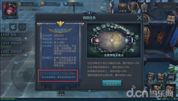 全民刺探期间,完成刺探任务,还可以额外获得20%经验加成。默认全民刺探开启时间为12:00-14:00,也可以由阵营领袖调整开启时间。