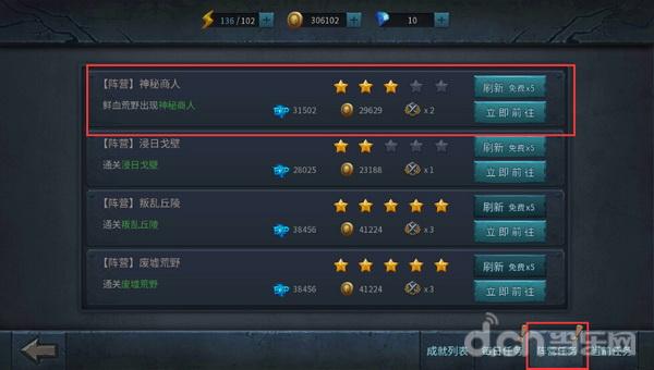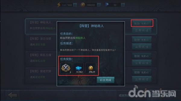 不同星级的阵营任务,将给予不同数量的奖励,每个玩家每天有5次免费刷新的机会,免费刷新机会用尽后,每次刷新需要消耗20钻石,点击立即前往,即可通过引导完成对应阵营任务。