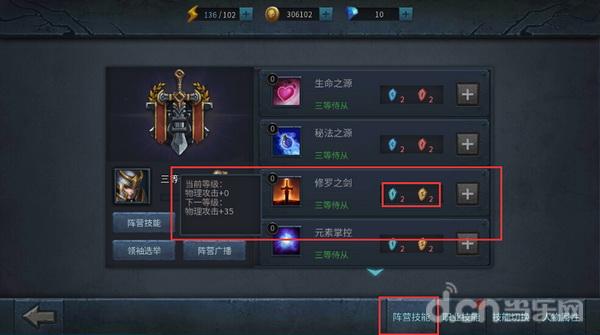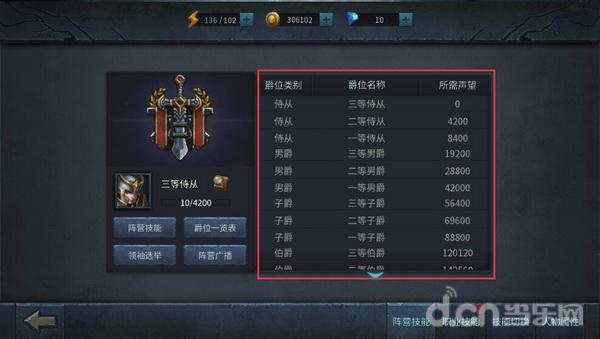 完成阵营任务的同时,还可获得升级“阵营技能”的晶石道具,消耗不同种类的晶石增加角色生命、物理攻击、魔法攻击等属性,阵营技能升级上限受爵位限制。点击主界面【头像】按钮,进入【阵营技能】升级界面。