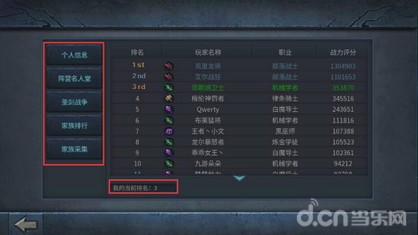 排行榜界面由上到下依次显示【个人信息】、【阵营名人堂】、【圣剑战争】、【家族排行】、【家族采集】排行榜,榜单右下方显示该玩家当前排名。