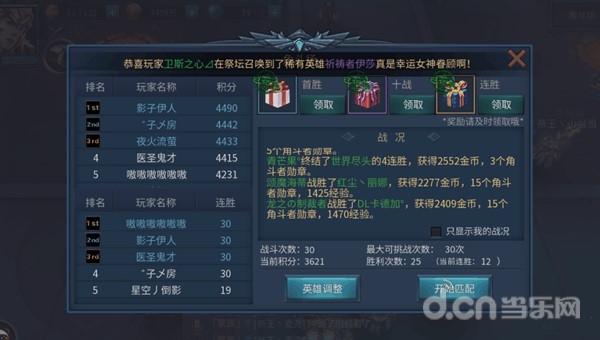 2.角斗奖励礼包有首胜礼包、十战礼包和十连胜礼包,所以大家尽量获得十次连胜拿满所有礼包。