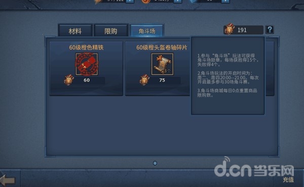 角斗场每次开启1个小时,每人共有30次机会,角逐可获得积分,所获得的积分最高者获得“战神”称号,参与角逐还可以获得角斗场勋章,胜利得15个,失败得4个,得到的勋章可以在商城兑换60级装备碎片和铁。