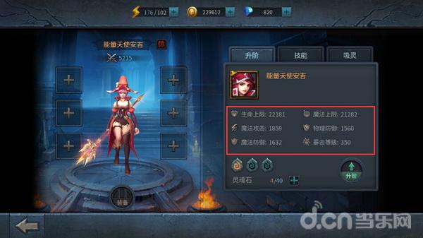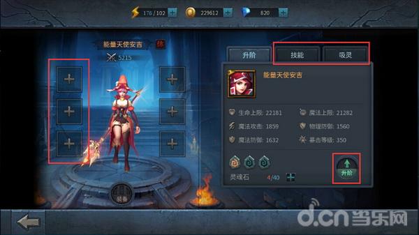 选择已经拥有的英雄,可以打开该英雄的操作界面,在此界面中可以对英雄穿戴装备、升阶、技能升级和吸灵操作。
